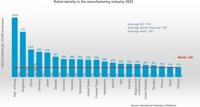 2023年的数据显示中国的机器人密度已达到每万名工人470台,不仅远超美国的295台,还一举超越了传统制造业强国德国(429台)和日本(419台),仅次于韩国和新加坡,位列全球第三。