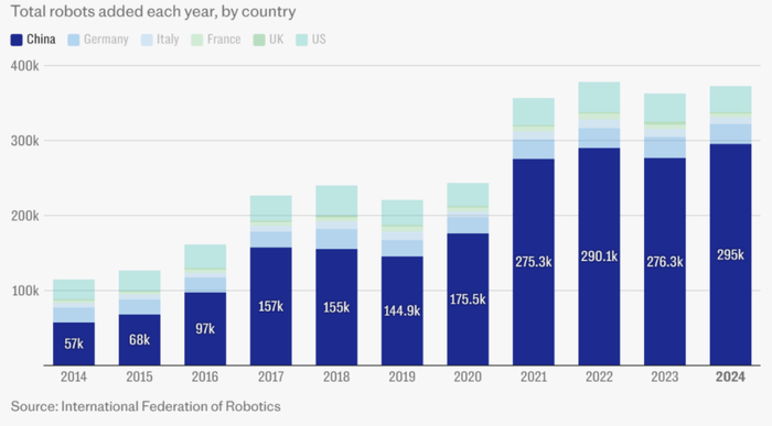 根据国际机器人联合会(IFR)的报告,2024年,中国一国的安装量就接近30万台,超过了世界其他地区的总和,几乎是美国的十倍。