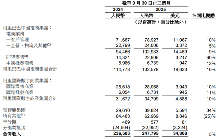 数据显示,2025年9月30日止六个月,阿里收入为4,954.47亿元,同比增长3%。若剔除高鑫零售和银泰的已处置业务收入,同口径收入同比增长将达到12%。