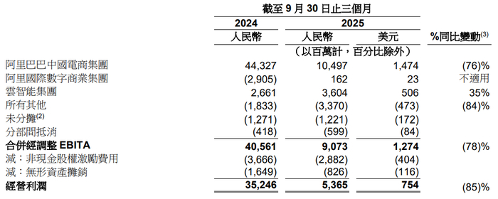 但利润数据就没那么好看了。如前面提到的,三季度阿里经营利润整体同比下降85%为53.65亿元,经调整EBITA下降78%为90.73亿元。